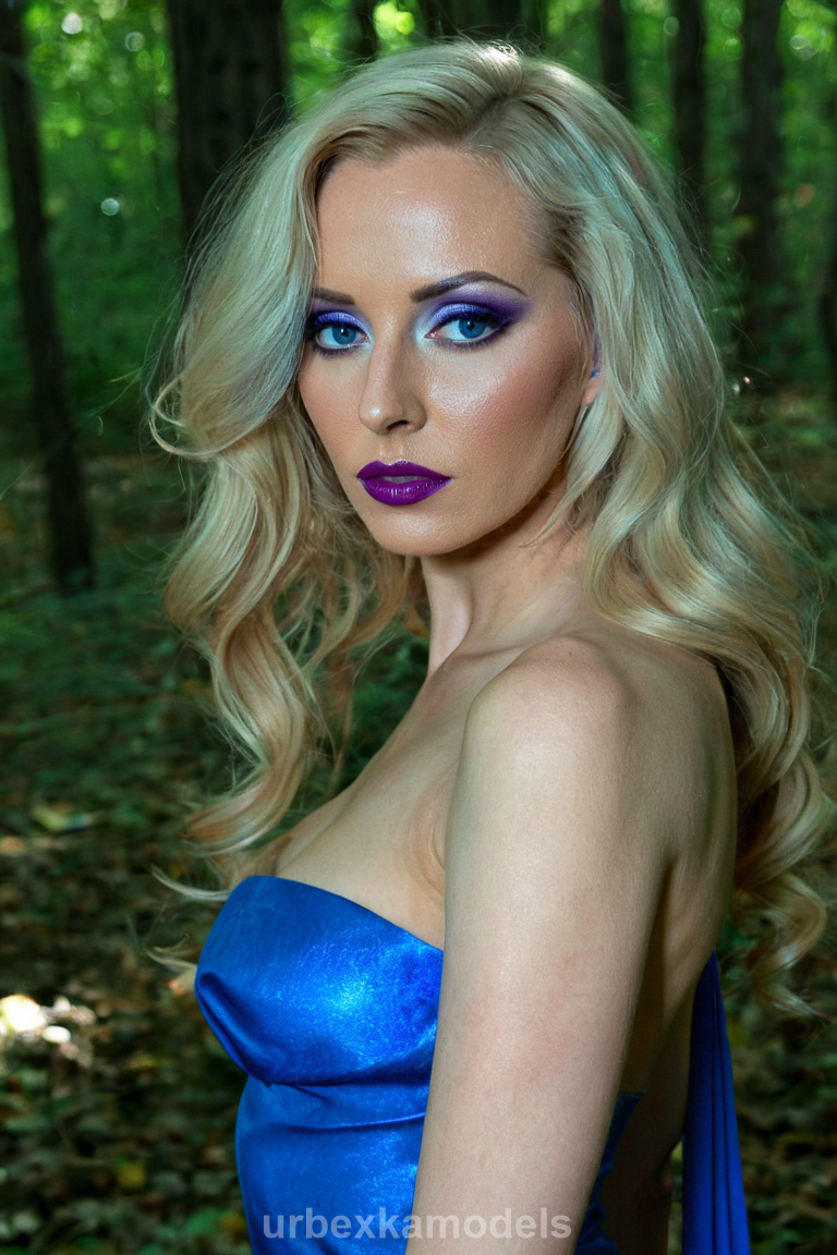 This gallery invites you into a dreamlike world where elegance and mystery intertwine. A blonde model, dressed in a shimmering blue gown, stands among the shadows of an ancient forest — the moonlight brushing her silhouette, the atmosphere alive with silent enchantment.