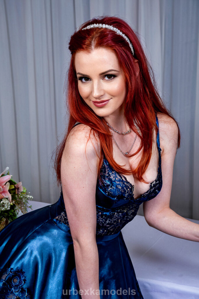 Midnight Ruby glows with jewel tones and warm candlelight. A red-haired model embodies festive elegance through velvet textures, metallic accents and confident, graceful poses.